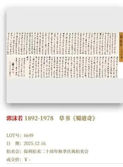 查询发现,截至12月12日,保利拍卖官网仍未撤下该拍品,其信息显示作品 “传承有序、原装原裱”,为郭沫若自作诗手卷,在拍卖市场极为罕见。郭庶英方面透露,曾与保利沟通但遭拒绝,对方坚持委托人有权处分。据业内人士介绍,拍卖行业多依托委托方提供的来源信息,仅做形式审查,遵循 “声明不保证权属” 惯例,若委托方隐瞒实情,拍卖方难避风险。